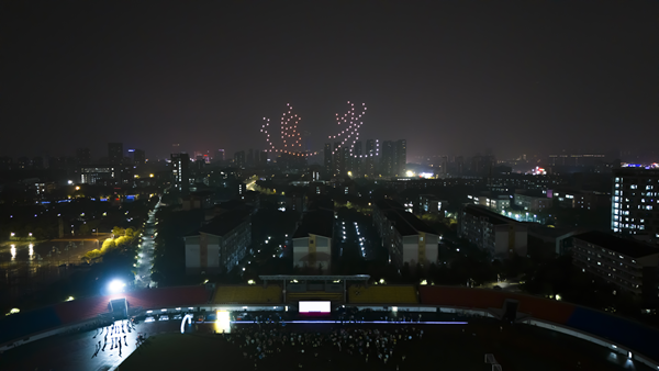 活动现场,100架由“挑战杯”团队参与设计的星光无人机点亮湖师校园的夜空。“追光、蓄力、炽热、奋斗、冲”等青春关键词揭幕,燃爆了全场。