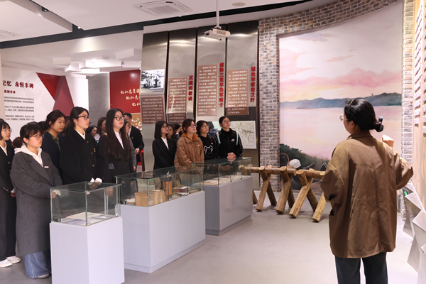 在郎部抗日纪念馆门前,中文系学生第三党支部书记吴安迪为党员们讲解了纪念馆的历史背景与抗战精神。她介绍,郎部抗日纪念馆是为纪念湖州地方代表性抗日队伍——“郎部”的英勇事迹而建,记录反映“郎部”在抗日战争岁月中浴血奋战的故事。随后,在讲解员的带领下,师生们驻足观看陈列实物、文献资料,深刻感悟革命年代的艰苦卓绝与先辈的家国情怀。